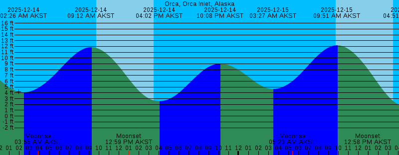 2025-12-14 10:08 PM AKST 9.03 feet High Tide 2025-12-15 03:27 AM AKST 4.67 feet Low Tide 2025-12-15 05:23 AM AKST Moonrise 2025-12-15 09:46 AM AKST Sunrise 2025-12-15 09:51 AM AKST 12.19 feet High Tide 2025-12-15 12:58 PM AKST Moonset 2025-12-15 03:30 PM AKST Sunset 2025-12-15 04:51 PM AKST 1.63 feet Low Tide 2025-12-15 11:07 PM AKST 9.35 feet High Tide 2025-12-16 04:21 AM AKST 4.97 feet Low Tide 2025-12-16 06:54 AM AKST Moonrise 2025-12-16 09:47 AM AKST Sunrise 2025-12-16 10:28 AM AKST 12.51 feet High Tide 2025-12-16 12:58 PM AKST Moonset 2025-12-16 03:30 PM AKST Sunset 2025-12-16 05:30 PM AKST 0.83 feet Low Tide 2025-12-16 11:58 PM AKST 9.77 feet High Tide 2025-12-17 05:07 AM AKST 5.06 feet Low Tide 2025-12-17 08:29 AM AKST Moonrise 2025-12-17 09:48 AM AKST Sunrise 2025-12-17 11:05 AM AKST 12.81 feet High Tide 2025-12-17 01:01 PM AKST Moonset 2025-12-17 03:30 PM AKST Sunset 2025-12-17 06:05 PM AKST 0.19 feet Low Tide 2025-12-18 12:43 AM AKST 10.19 feet High Tide 2025-12-18 05:48 AM AKST 5.03 feet Low Tide 2025-12-18 09:49 AM AKST Sunrise 2025-12-18 10:03 AM AKST Moonrise 2025-12-18 11:43 AM AKST 13.08 feet High Tide 2025-12-18 01:11 PM AKST Moonset 2025-12-18 03:30 PM AKST Sunset |