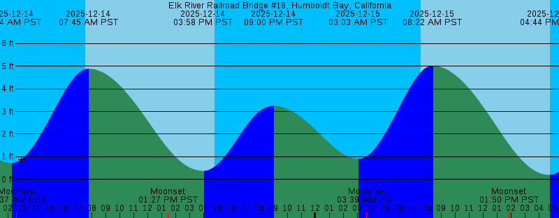 Note: Due to bottom configuration and depths at low water stages, a low water stand may occur at this location. 2025-12-14 07:33 AM PST Sunrise 2025-12-14 07:45 AM PST 4.88 feet High Tide 2025-12-14 01:27 PM PST Moonset 2025-12-14 03:58 PM PST 0.37 feet Low Tide 2025-12-14 04:49 PM PST Sunset 2025-12-14 09:00 PM PST 3.25 feet High Tide 2025-12-15 03:03 AM PST 0.90 feet Low Tide 2025-12-15 03:39 AM PST Moonrise 2025-12-15 07:34 AM PST Sunrise 2025-12-15 08:22 AM PST 5.02 feet High Tide 2025-12-15 01:50 PM PST Moonset 2025-12-15 04:44 PM PST 0.20 feet Low Tide 2025-12-15 04:50 PM PST Sunset 2025-12-15 10:09 PM PST 3.39 feet High Tide 2025-12-16 03:51 AM PST 1.04 feet Low Tide 2025-12-16 04:42 AM PST Moonrise 2025-12-16 07:34 AM PST Sunrise 2025-12-16 08:57 AM PST 5.12 feet High Tide 2025-12-16 02:18 PM PST Moonset 2025-12-16 04:50 PM PST Sunset 2025-12-16 05:25 PM PST 0.06 feet Low Tide 2025-12-16 11:05 PM PST 3.56 feet High Tide 2025-12-17 04:37 AM PST 1.13 feet Low Tide 2025-12-17 05:44 AM PST Moonrise 2025-12-17 07:35 AM PST Sunrise 2025-12-17 09:32 AM PST 5.21 feet High Tide 2025-12-17 02:51 PM PST Moonset 2025-12-17 04:50 PM PST Sunset 2025-12-17 06:02 PM PST -0.05 feet Low Tide 2025-12-17 11:49 PM PST 3.71 feet High Tide 2025-12-18 05:20 AM PST 1.18 feet Low Tide |