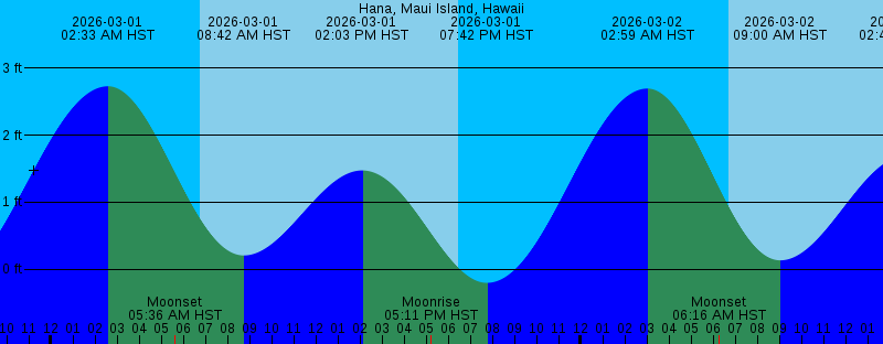 2026-03-01 02:33 AM HST 2.73 feet High Tide 2026-03-01 05:36 AM HST Moonset 2026-03-01 06:43 AM HST Sunrise 2026-03-01 08:42 AM HST 0.21 feet Low Tide 2026-03-01 02:03 PM HST 1.48 feet High Tide 2026-03-01 05:11 PM HST Moonrise 2026-03-01 06:28 PM HST Sunset 2026-03-01 07:42 PM HST -0.20 feet Low Tide 2026-03-02 02:59 AM HST 2.70 feet High Tide 2026-03-02 06:16 AM HST Moonset 2026-03-02 06:43 AM HST Sunrise 2026-03-02 09:00 AM HST 0.13 feet Low Tide 2026-03-02 02:43 PM HST 1.70 feet High Tide 2026-03-02 06:09 PM HST Moonrise 2026-03-02 06:29 PM HST Sunset 2026-03-02 08:20 PM HST -0.16 feet Low Tide 2026-03-03 01:39 AM HST Full Moon 2026-03-03 03:23 AM HST 2.59 feet High Tide 2026-03-03 06:42 AM HST Sunrise 2026-03-03 06:51 AM HST Moonset 2026-03-03 09:19 AM HST 0.07 feet Low Tide 2026-03-03 03:21 PM HST 1.87 feet High Tide 2026-03-03 06:29 PM HST Sunset 2026-03-03 07:04 PM HST Moonrise 2026-03-03 08:56 PM HST -0.07 feet Low Tide 2026-03-04 03:44 AM HST 2.43 feet High Tide 2026-03-04 06:41 AM HST Sunrise 2026-03-04 07:25 AM HST Moonset 2026-03-04 09:39 AM HST 0.01 feet Low Tide 2026-03-04 03:58 PM HST 1.99 feet High Tide 2026-03-04 06:29 PM HST Sunset 2026-03-04 07:57 PM HST Moonrise 2026-03-04 09:31 PM HST 0.05 feet Low Tide |