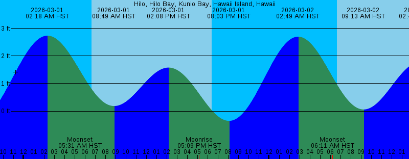 2026-03-01 02:18 AM HST 2.73 feet High Tide 2026-03-01 05:31 AM HST Moonset 2026-03-01 06:39 AM HST Sunrise 2026-03-01 08:49 AM HST 0.18 feet Low Tide 2026-03-01 02:08 PM HST 1.58 feet High Tide 2026-03-01 05:09 PM HST Moonrise 2026-03-01 06:25 PM HST Sunset 2026-03-01 08:03 PM HST -0.35 feet Low Tide 2026-03-02 02:49 AM HST 2.70 feet High Tide 2026-03-02 06:11 AM HST Moonset 2026-03-02 06:38 AM HST Sunrise 2026-03-02 09:13 AM HST 0.06 feet Low Tide 2026-03-02 02:48 PM HST 1.79 feet High Tide 2026-03-02 06:06 PM HST Moonrise 2026-03-02 06:25 PM HST Sunset 2026-03-02 08:44 PM HST -0.27 feet Low Tide 2026-03-03 01:39 AM HST Full Moon 2026-03-03 03:16 AM HST 2.59 feet High Tide 2026-03-03 06:38 AM HST Sunrise 2026-03-03 06:47 AM HST Moonset 2026-03-03 09:37 AM HST -0.05 feet Low Tide 2026-03-03 03:27 PM HST 1.96 feet High Tide 2026-03-03 06:26 PM HST Sunset 2026-03-03 07:00 PM HST Moonrise 2026-03-03 09:22 PM HST -0.12 feet Low Tide 2026-03-04 03:41 AM HST 2.42 feet High Tide 2026-03-04 06:37 AM HST Sunrise 2026-03-04 07:21 AM HST Moonset 2026-03-04 10:00 AM HST -0.12 feet Low Tide 2026-03-04 04:04 PM HST 2.07 feet High Tide 2026-03-04 06:26 PM HST Sunset 2026-03-04 07:52 PM HST Moonrise |