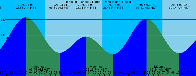2026-03-01 02:56 AM HST 2.15 feet High Tide 2026-03-01 05:45 AM HST Moonset 2026-03-01 06:51 AM HST Sunrise 2026-03-01 09:50 AM HST -0.13 feet Low Tide 2026-03-01 03:11 PM HST 0.91 feet High Tide 2026-03-01 05:19 PM HST Moonrise 2026-03-01 06:35 PM HST Sunset 2026-03-01 08:41 PM HST -0.21 feet Low Tide 2026-03-02 03:31 AM HST 2.06 feet High Tide 2026-03-02 06:24 AM HST Moonset 2026-03-02 06:50 AM HST Sunrise 2026-03-02 10:14 AM HST -0.16 feet Low Tide 2026-03-02 03:51 PM HST 1.10 feet High Tide 2026-03-02 06:16 PM HST Moonrise 2026-03-02 06:36 PM HST Sunset 2026-03-02 09:28 PM HST -0.14 feet Low Tide 2026-03-03 01:39 AM HST Full Moon 2026-03-03 04:03 AM HST 1.91 feet High Tide 2026-03-03 06:50 AM HST Sunrise 2026-03-03 06:59 AM HST Moonset 2026-03-03 10:38 AM HST -0.17 feet Low Tide 2026-03-03 04:31 PM HST 1.28 feet High Tide 2026-03-03 06:36 PM HST Sunset 2026-03-03 07:11 PM HST Moonrise 2026-03-03 10:14 PM HST -0.03 feet Low Tide 2026-03-04 04:33 AM HST 1.72 feet High Tide 2026-03-04 06:49 AM HST Sunrise 2026-03-04 07:33 AM HST Moonset 2026-03-04 11:00 AM HST -0.17 feet Low Tide 2026-03-04 05:09 PM HST 1.42 feet High Tide 2026-03-04 06:37 PM HST Sunset 2026-03-04 08:05 PM HST Moonrise |