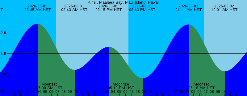2026-03-01 03:45 AM HST 2.45 feet High Tide 2026-03-01 05:38 AM HST Moonset 2026-03-01 06:45 AM HST Sunrise 2026-03-01 09:43 AM HST 0.21 feet Low Tide 2026-03-01 03:15 PM HST 1.32 feet High Tide 2026-03-01 05:13 PM HST Moonrise 2026-03-01 06:30 PM HST Sunset 2026-03-01 08:43 PM HST -0.20 feet Low Tide 2026-03-02 04:11 AM HST 2.41 feet High Tide 2026-03-02 06:18 AM HST Moonset 2026-03-02 06:45 AM HST Sunrise 2026-03-02 10:01 AM HST 0.13 feet Low Tide 2026-03-02 03:55 PM HST 1.52 feet High Tide 2026-03-02 06:11 PM HST Moonrise 2026-03-02 06:30 PM HST Sunset 2026-03-02 09:21 PM HST -0.16 feet Low Tide 2026-03-03 01:39 AM HST Full Moon 2026-03-03 04:35 AM HST 2.32 feet High Tide 2026-03-03 06:44 AM HST Sunrise 2026-03-03 06:53 AM HST Moonset 2026-03-03 10:20 AM HST 0.07 feet Low Tide 2026-03-03 04:33 PM HST 1.68 feet High Tide 2026-03-03 06:31 PM HST Sunset 2026-03-03 07:06 PM HST Moonrise 2026-03-03 09:57 PM HST -0.07 feet Low Tide 2026-03-04 04:56 AM HST 2.18 feet High Tide 2026-03-04 06:43 AM HST Sunrise 2026-03-04 07:27 AM HST Moonset 2026-03-04 10:40 AM HST 0.01 feet Low Tide 2026-03-04 05:10 PM HST 1.78 feet High Tide 2026-03-04 06:31 PM HST Sunset 2026-03-04 07:59 PM HST Moonrise |