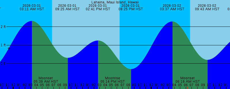2026-03-01 03:11 AM HST 2.32 feet High Tide 2026-03-01 05:39 AM HST Moonset 2026-03-01 06:46 AM HST Sunrise 2026-03-01 09:25 AM HST 0.31 feet Low Tide 2026-03-01 02:41 PM HST 1.25 feet High Tide 2026-03-01 05:14 PM HST Moonrise 2026-03-01 06:31 PM HST Sunset 2026-03-01 08:25 PM HST -0.30 feet Low Tide 2026-03-02 03:37 AM HST 2.29 feet High Tide 2026-03-02 06:19 AM HST Moonset 2026-03-02 06:45 AM HST Sunrise 2026-03-02 09:43 AM HST 0.20 feet Low Tide 2026-03-02 03:21 PM HST 1.44 feet High Tide 2026-03-02 06:12 PM HST Moonrise 2026-03-02 06:31 PM HST Sunset 2026-03-02 09:03 PM HST -0.24 feet Low Tide 2026-03-03 01:39 AM HST Full Moon 2026-03-03 04:01 AM HST 2.20 feet High Tide 2026-03-03 06:45 AM HST Sunrise 2026-03-03 06:54 AM HST Moonset 2026-03-03 10:02 AM HST 0.10 feet Low Tide 2026-03-03 03:59 PM HST 1.59 feet High Tide 2026-03-03 06:32 PM HST Sunset 2026-03-03 07:07 PM HST Moonrise 2026-03-03 09:39 PM HST -0.11 feet Low Tide 2026-03-04 04:22 AM HST 2.06 feet High Tide 2026-03-04 06:44 AM HST Sunrise 2026-03-04 07:28 AM HST Moonset 2026-03-04 10:22 AM HST 0.01 feet Low Tide 2026-03-04 04:36 PM HST 1.68 feet High Tide 2026-03-04 06:32 PM HST Sunset 2026-03-04 08:00 PM HST Moonrise |