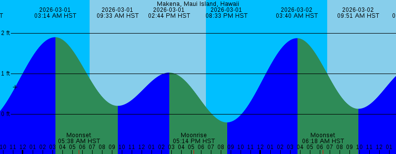 2026-03-01 03:14 AM HST 1.90 feet High Tide 2026-03-01 05:38 AM HST Moonset 2026-03-01 06:45 AM HST Sunrise 2026-03-01 09:33 AM HST 0.21 feet Low Tide 2026-03-01 02:44 PM HST 1.03 feet High Tide 2026-03-01 05:14 PM HST Moonrise 2026-03-01 06:30 PM HST Sunset 2026-03-01 08:33 PM HST -0.20 feet Low Tide 2026-03-02 03:40 AM HST 1.88 feet High Tide 2026-03-02 06:18 AM HST Moonset 2026-03-02 06:44 AM HST Sunrise 2026-03-02 09:51 AM HST 0.13 feet Low Tide 2026-03-02 03:24 PM HST 1.18 feet High Tide 2026-03-02 06:11 PM HST Moonrise 2026-03-02 06:30 PM HST Sunset 2026-03-02 09:11 PM HST -0.16 feet Low Tide 2026-03-03 01:39 AM HST Full Moon 2026-03-03 04:04 AM HST 1.80 feet High Tide 2026-03-03 06:44 AM HST Sunrise 2026-03-03 06:53 AM HST Moonset 2026-03-03 10:10 AM HST 0.07 feet Low Tide 2026-03-03 04:02 PM HST 1.30 feet High Tide 2026-03-03 06:31 PM HST Sunset 2026-03-03 07:06 PM HST Moonrise 2026-03-03 09:47 PM HST -0.07 feet Low Tide 2026-03-04 04:25 AM HST 1.69 feet High Tide 2026-03-04 06:43 AM HST Sunrise 2026-03-04 07:27 AM HST Moonset 2026-03-04 10:30 AM HST 0.01 feet Low Tide 2026-03-04 04:39 PM HST 1.38 feet High Tide 2026-03-04 06:31 PM HST Sunset 2026-03-04 07:59 PM HST Moonrise |