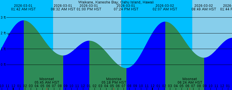 2026-03-01 01:42 AM HST 2.82 feet High Tide 2026-03-01 05:45 AM HST Moonset 2026-03-01 06:51 AM HST Sunrise 2026-03-01 08:32 AM HST 0.59 feet Low Tide 2026-03-01 01:00 PM HST 1.53 feet High Tide 2026-03-01 05:18 PM HST Moonrise 2026-03-01 06:35 PM HST Sunset 2026-03-01 07:24 PM HST -0.22 feet Low Tide 2026-03-02 02:07 AM HST 2.74 feet High Tide 2026-03-02 06:24 AM HST Moonset 2026-03-02 06:50 AM HST Sunrise 2026-03-02 08:49 AM HST 0.45 feet Low Tide 2026-03-02 01:44 PM HST 1.71 feet High Tide 2026-03-02 06:16 PM HST Moonrise 2026-03-02 06:36 PM HST Sunset 2026-03-02 08:03 PM HST -0.11 feet Low Tide 2026-03-03 01:39 AM HST Full Moon 2026-03-03 02:29 AM HST 2.61 feet High Tide 2026-03-03 06:50 AM HST Sunrise 2026-03-03 06:59 AM HST Moonset 2026-03-03 09:08 AM HST 0.31 feet Low Tide 2026-03-03 02:26 PM HST 1.86 feet High Tide 2026-03-03 06:36 PM HST Sunset 2026-03-03 07:11 PM HST Moonrise 2026-03-03 08:39 PM HST 0.07 feet Low Tide 2026-03-04 02:49 AM HST 2.43 feet High Tide 2026-03-04 06:49 AM HST Sunrise 2026-03-04 07:33 AM HST Moonset 2026-03-04 09:28 AM HST 0.18 feet Low Tide 2026-03-04 03:06 PM HST 1.95 feet High Tide 2026-03-04 06:36 PM HST Sunset 2026-03-04 08:05 PM HST Moonrise 2026-03-04 09:15 PM HST 0.30 feet Low Tide |
