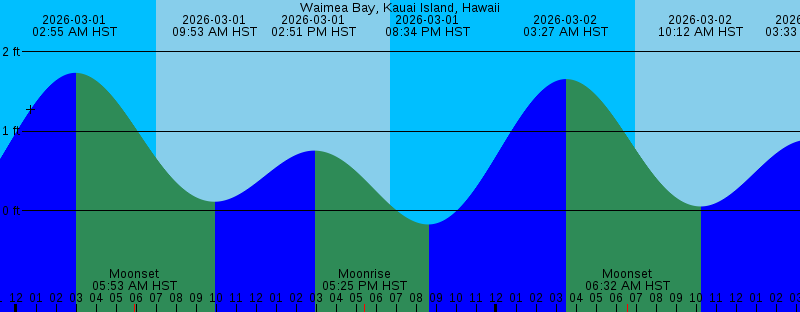 2026-03-01 02:55 AM HST 1.73 feet High Tide 2026-03-01 05:53 AM HST Moonset 2026-03-01 06:59 AM HST Sunrise 2026-03-01 09:53 AM HST 0.11 feet Low Tide 2026-03-01 02:51 PM HST 0.75 feet High Tide 2026-03-01 05:25 PM HST Moonrise 2026-03-01 06:42 PM HST Sunset 2026-03-01 08:34 PM HST -0.18 feet Low Tide 2026-03-02 03:27 AM HST 1.66 feet High Tide 2026-03-02 06:32 AM HST Moonset 2026-03-02 06:58 AM HST Sunrise 2026-03-02 10:12 AM HST 0.05 feet Low Tide 2026-03-02 03:33 PM HST 0.89 feet High Tide 2026-03-02 06:23 PM HST Moonrise 2026-03-02 06:43 PM HST Sunset 2026-03-02 09:19 PM HST -0.11 feet Low Tide 2026-03-03 01:39 AM HST Full Moon 2026-03-03 03:56 AM HST 1.53 feet High Tide 2026-03-03 06:57 AM HST Sunrise 2026-03-03 07:07 AM HST Moonset 2026-03-03 10:31 AM HST -0.01 feet Low Tide 2026-03-03 04:13 PM HST 1.01 feet High Tide 2026-03-03 06:43 PM HST Sunset 2026-03-03 07:19 PM HST Moonrise 2026-03-03 10:03 PM HST -0.01 feet Low Tide 2026-03-04 04:21 AM HST 1.37 feet High Tide 2026-03-04 06:56 AM HST Sunrise 2026-03-04 07:40 AM HST Moonset 2026-03-04 10:51 AM HST -0.06 feet Low Tide 2026-03-04 04:54 PM HST 1.11 feet High Tide 2026-03-04 06:43 PM HST Sunset 2026-03-04 08:12 PM HST Moonrise 2026-03-04 10:47 PM HST 0.13 feet Low Tide |