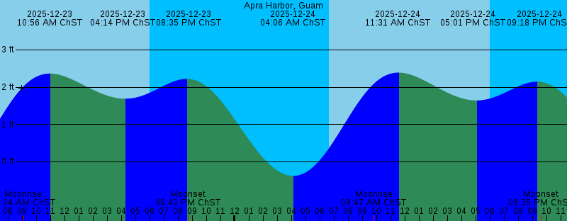 2025-12-23 09:04 AM ChST Moonrise 2025-12-23 10:56 AM ChST 2.36 feet High Tide 2025-12-23 04:14 PM ChST 1.69 feet Low Tide 2025-12-23 06:00 PM ChST Sunset 2025-12-23 08:35 PM ChST 2.22 feet High Tide 2025-12-23 08:43 PM ChST Moonset 2025-12-24 04:06 AM ChST -0.38 feet Low Tide 2025-12-24 06:41 AM ChST Sunrise 2025-12-24 09:47 AM ChST Moonrise 2025-12-24 11:31 AM ChST 2.39 feet High Tide 2025-12-24 05:01 PM ChST 1.64 feet Low Tide 2025-12-24 06:00 PM ChST Sunset 2025-12-24 09:18 PM ChST 2.15 feet High Tide 2025-12-24 09:35 PM ChST Moonset 2025-12-25 04:43 AM ChST -0.23 feet Low Tide 2025-12-25 06:41 AM ChST Sunrise 2025-12-25 10:27 AM ChST Moonrise 2025-12-25 12:05 PM ChST 2.42 feet High Tide 2025-12-25 05:54 PM ChST 1.53 feet Low Tide 2025-12-25 06:01 PM ChST Sunset 2025-12-25 10:10 PM ChST 2.02 feet High Tide 2025-12-25 10:26 PM ChST Moonset 2025-12-26 05:22 AM ChST -0.01 feet Low Tide 2025-12-26 06:41 AM ChST Sunrise 2025-12-26 11:05 AM ChST Moonrise 2025-12-26 12:38 PM ChST 2.44 feet High Tide 2025-12-26 06:01 PM ChST Sunset 2025-12-26 06:50 PM ChST 1.31 feet Low Tide 2025-12-26 11:16 PM ChST Moonset 2025-12-26 11:18 PM ChST 1.86 feet High Tide 2025-12-27 06:04 AM ChST 0.28 feet Low Tide 2025-12-27 06:42 AM ChST Sunrise |